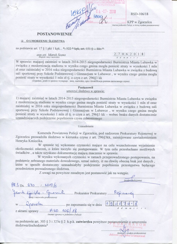 Umorzone zostało śledztwo w sprawie niegospodarności w związku z modernizacją stadionu w Lubawce oraz budową sali sportowej przy Szkole Podstawowej i Gimnazjum w Lubawce. KPP w Zgorzelcu umorzyło 27.06.2018 r. śledztwo w tej sprawie.
