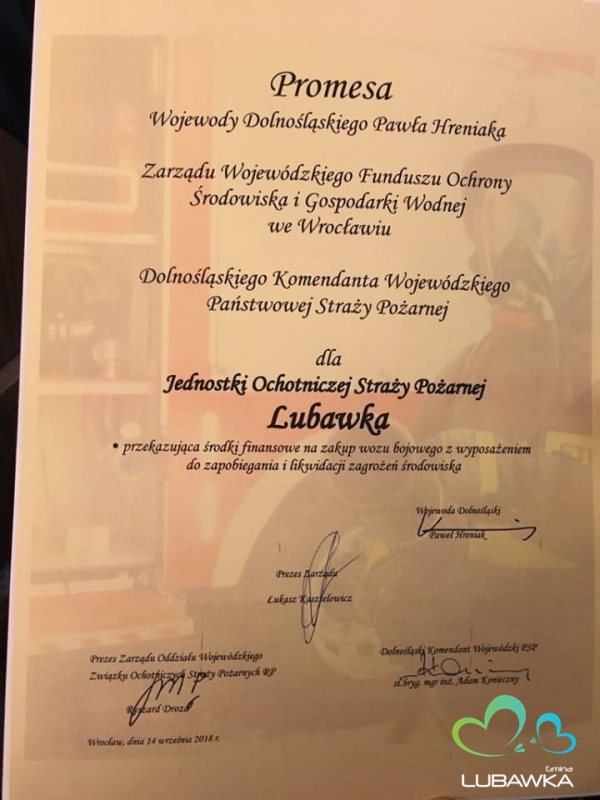 Po wielu, długich miesiącach szkukania źródeł finansowania, pisania wniosków o dofinansowanie, spinania budżetu i ustalania specyfikacji technicznej, ochotnicy z Ochotniczej Straży Pożarnej w Lubawce odebrali promesę - od Wojewody Dolnośląskiego Pawła Hreniaka Zarządu Wojewódzkiego Funduszu Ochrony Środowiska i Gospodarki Wodnej we Wrocławiu. "Zakup średniego samochodu ratowniczo-gaśniczego dla OSP Lubawka", która znajduję się w systemie KSRG nastąpi do 20.10.20018 r. Przypominamy, że wykonawca został wyłoniony w przetargu nieograniczonym za cenę 841.935,00 zł.