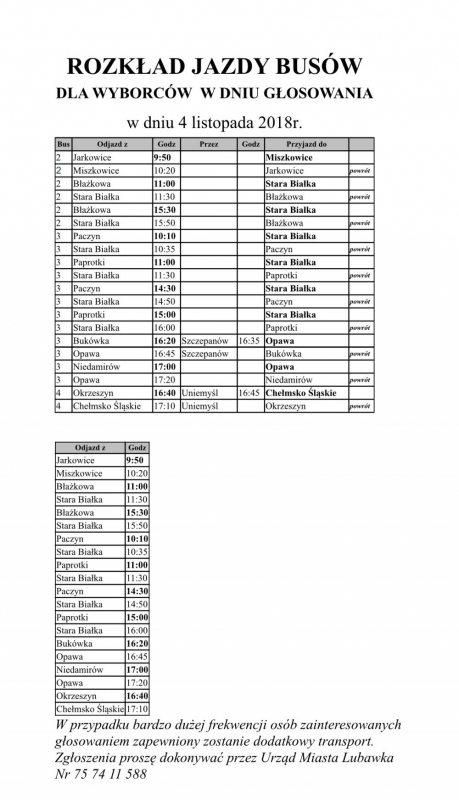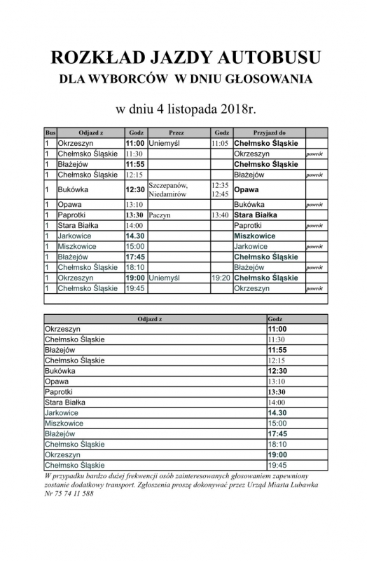 Rozkład jazdy busów i autobusów w dniu 4 listopada Już jutro II tura wyborów samorządowych, poniżej znajda państwo rozkłady jazdy busów i autobusów. Galeria zdjęć Pliki do pobrania Rozklad jazdy Katarzyna Biroś OELiUSC Data wydarzenia: 2018-11-03 Stworzony: 2018-11-03 18:52 Edytowany: 2018-11-03 19:00