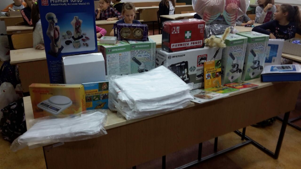 W ramach projektu szkoły otrzymała mikroskopy, preparaty, szkło laboratoryjne, odczynniki chemiczne, globusy, mapy, książki, wagi laboratoryjne, zestawy elektryczne, modele brył i mnóstwo innych sprzętów niezbędnych do nauki przedmiotów objętych w ramach projektu.