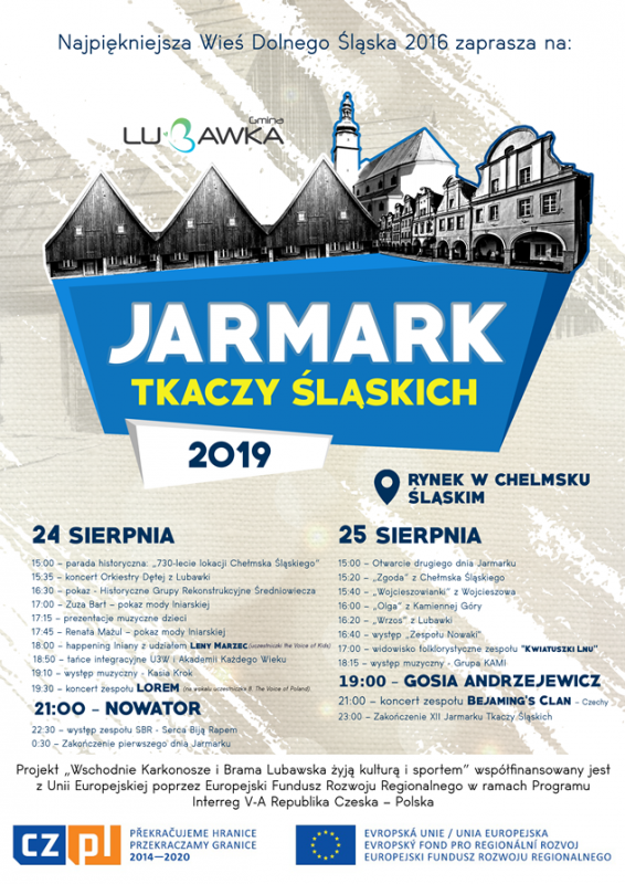 Przypominamy, że Impreza organizowana jest w ramach projektu pn. "Wschodnie Karkonosze i Brama Lubawska żyją kulturą i sportem" współfinansowany z Unii Europejskiej poprzez Europejski Fundusz Rozwoju Regionalnego w ramach Programu Interreg V-A Republika Czeska-Polska.