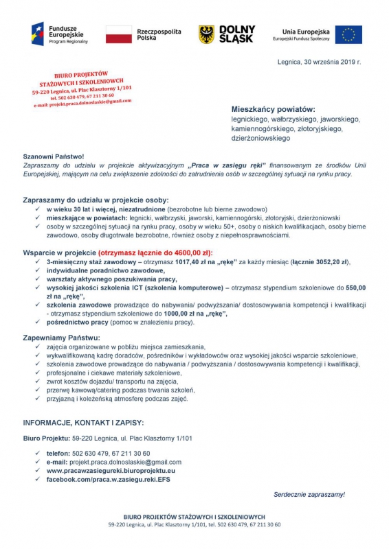 Biuro Projektów Stażowych i Szkoleniowych z Legnicy zaprasza do udziału w projekcie aktywizacyjnym "Praca w zasięgu ręki" finansowanym ze środków Unii Europejskiej, mającym na celu zwiększenie zdolności do zatrudnienia osób w szczególnej sytuacji na rynku pracy.