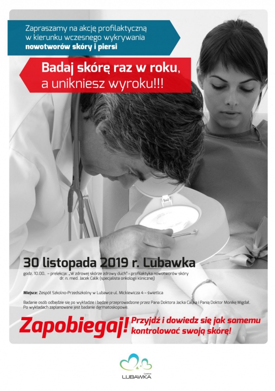 Zapraszamy na akcję profilaktyczną w kierunku wczesnego wykrywania nowotworów skóry, która odbędzie się jutro, 30 listopada 2019 r. (sobota) w Zespole Szkolno-Przedszkolnym w Lubawce, ul. Mickiewicza 4 - świetlica. Rozpoczęcie nastąpi o godz. 10.00 prelekcją dr. n. med. Pana Jacka Calika dotyczącą profilaktyki nowotworów skóry. Po wykładzie zaplanowane są badania dermatoskopowe i będą przeprowadzone przez Pana Doktora Jacka Calika i Panią Doktor Monikę Migdał. Zapraszamy!