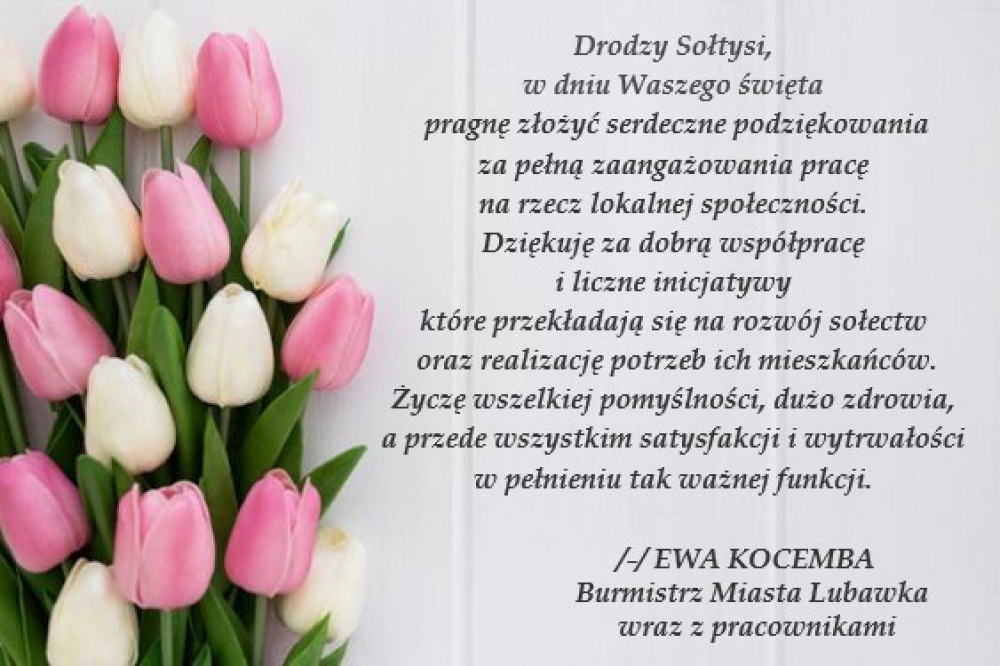 Życzenia z okazji Dnia Sołtysa od Burmistrza Miasta Lubawka Wszystkiego najlepszego z okazji Dnia Sołtysa! Galeria zdjęć Marlena Popławska Organizacyjny Data wydarzenia: 2020-03-11 Stworzony: 2020-03-11 08:52 Edytowany: 2020-03-11 09:11