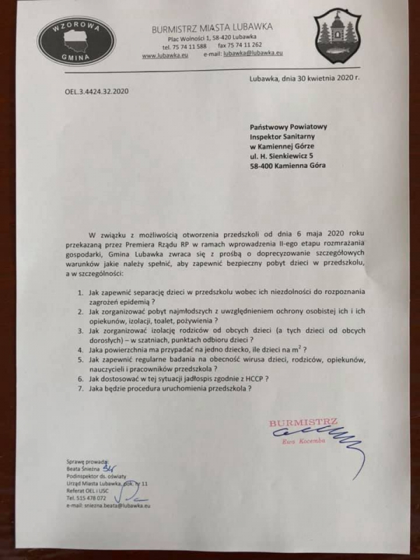 30 kwietnia 2020 r. Burmistrz Miasta Lubawka po konsultacjach z dyrektorami szkół i przedszkoli wystąpiła do Powiatowego Inspektora Sanitarnego o wyjaśnienie nurtujących pytań, jakie warunki należy spełnić, aby zapewnić bezpieczeństwo w przedszkolach dla dzieci, rodziców i pracowników.
