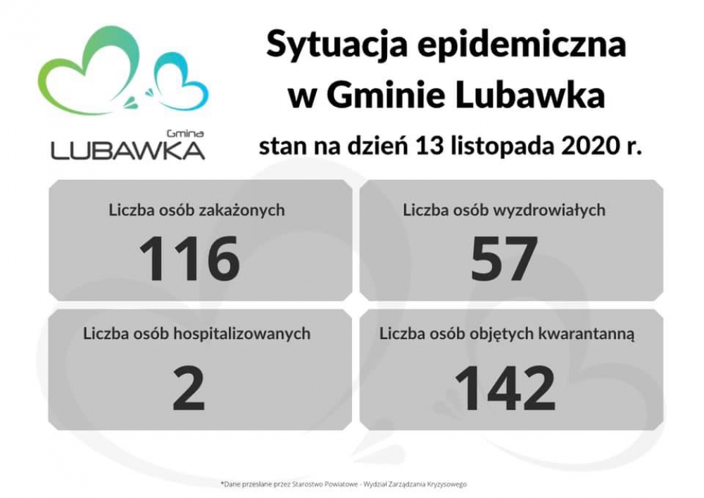 Sytuacja epidemiczna stan na 13 listopada 2020 r. Aktualne dane pochodzą z informacji podanych przez Starostwo Powiatowe w Kamiennej Górze - Wydział Zarządzania Kryzysowego. Galeria zdjęć Marcelina Zegan-Jóźwiak Wydział Rozwoju i Oświaty Data wydarzenia: 2020-11-13 Stworzony: 2020-11-13 08:20 Edytowany: 2020-11-16 07:43