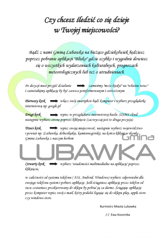 Bądź z nami Gminą Lubawka na bieżąco gdziekolwiek będziesz poprzez pobranie aplikacji "Blisko" gdzie szybko i wygodnie dowiesz się o wszystkich wydarzeniach kulturalnych, prognozach meteorologicznych lub też o utrudnieniach.