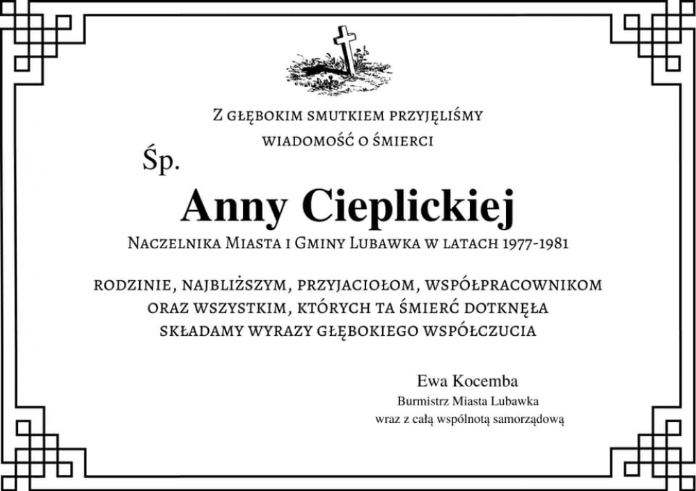 Kondolencje Rodzinie i najbliższym Śp. Anny Cieplickiej, Naczelnika Miasta i Gminy Lubawka w latach 1977-1981 składamy wyrazy głębokiego współczucia. Galeria zdjęć Marcelina Zegan-Jóźwiak Wydział Rozwoju i Oświaty Data wydarzenia: 2021-02-03 Stworzony: 2021-02-04 09:16 Edytowany: 2021-02-04 09:32