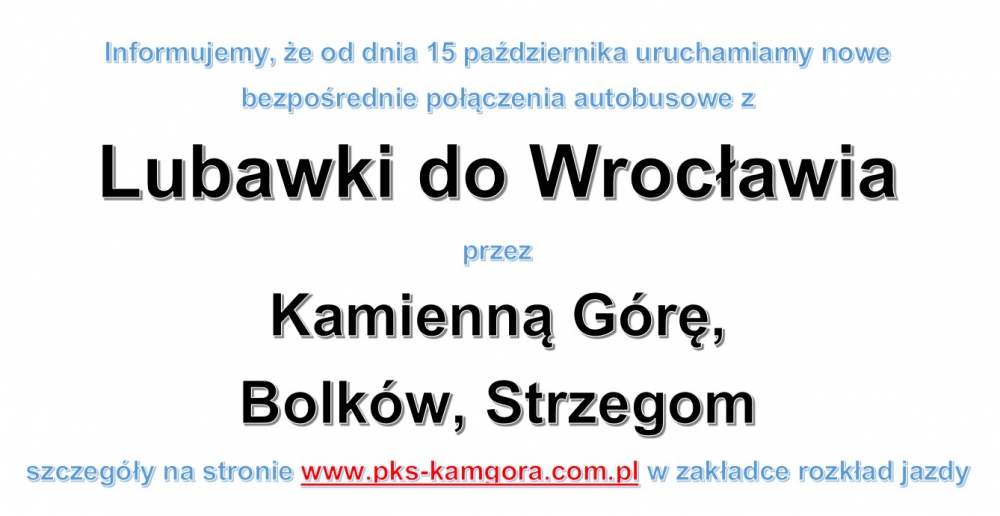 Efektem negocjacji prowadzonych przez Zastępcę Burmistrza Miasta Lubawka Sławomira Antoniewskiego z Prezesem Zarządu Spółki PKS Kamienna Góra Sp. z o.o. Panem Konradem Karmelitą, jest powstanie nowego, bezpośrednie połączenie komunikacyjnego na trasie Lubawka ? Wrocław przez Kamienną Górę, Bolków i Strzegom.