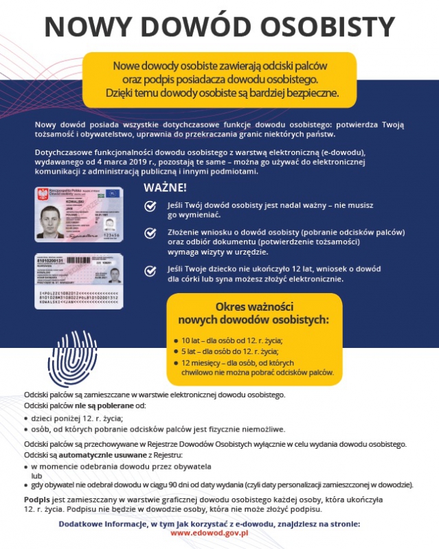 Nowe dowody będą wydawane na 10 lat dla osób powyżej 12. roku życia, dla osób do 12. roku życia dowód będzie wydawany na 5 lat, bez pobierania odcisków palców.