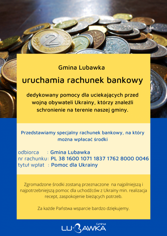 Gmina Lubawka uruchomiła specjalny rachunek bankowy, na który migą Państwo wpłacać darowizny dla uciekajacych przed wojną obywateli Ukrainy.