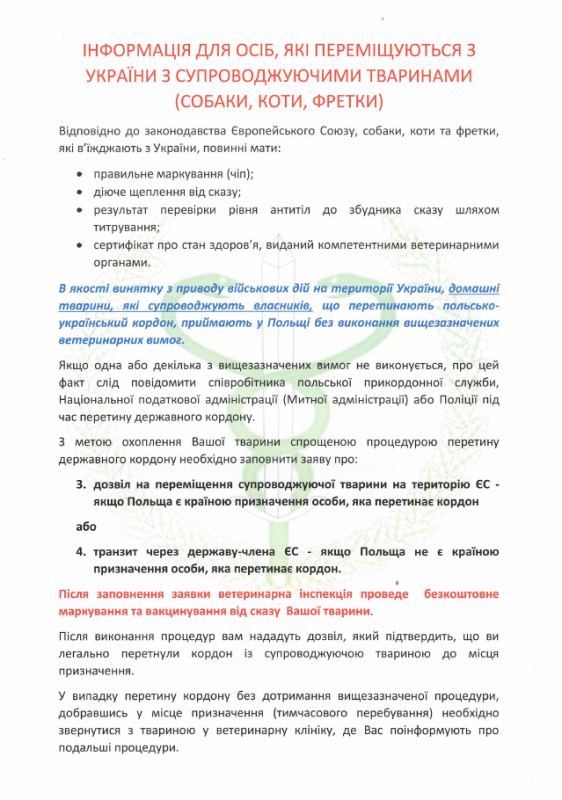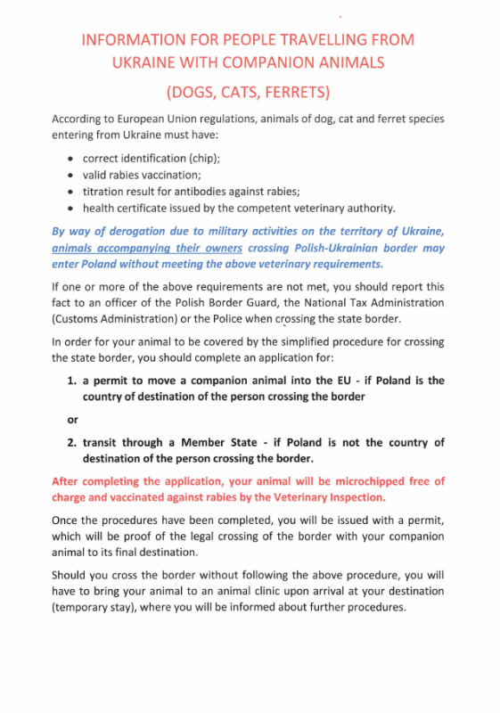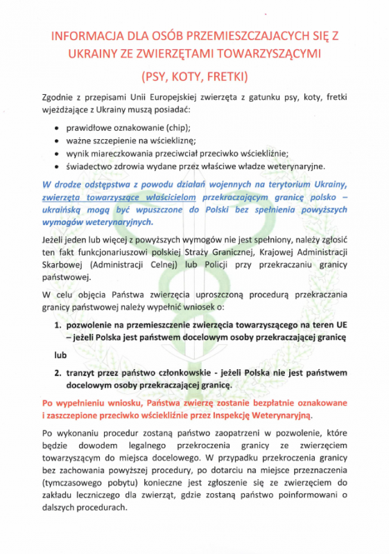 Informacja Powiatowego Lekarza Weterynarii w Kamiennej Górze Przedstawiamy informację dla osób przemieszczających się z Ukrainy ze zwierzętami towarzyszącymi (psy, koty, fretki). Galeria zdjęć Marcelina Zegan-Jóźwiak Wydział Rozwoju i Oświaty Data wydarzenia: 2022-03-28 Stworzony: 2022-03-28 08:44 Edytowany: 2022-03-28 08:47