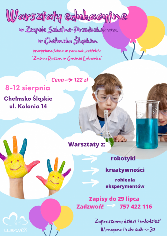 W Zespole Szkolno-Przedszkolnym w Chełmsku Śląskim, w dniach 8-12 sierpnia, odbędą się warsztaty edukacyjne z robotyki, kreatywności i robienia eksperymentów.