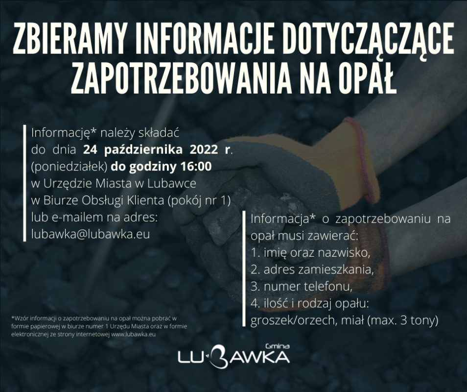 Wzór informacji o zapotrzebowaniu na opał można pobrać w formie papierowej w biurze numer 1 Urzędu Miasta oraz w formie elektronicznej ze strony internetowej lubawka.eu