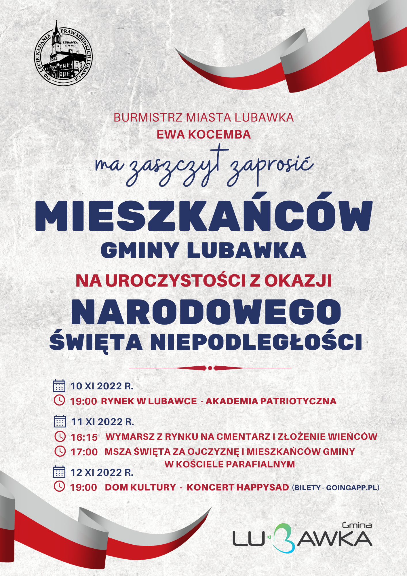 10 listopada o godz. 19:00 na lubawskim rynku odbędzie się uroczyste wciągnięcie flagi na nowo powstały maszt, później zaprezentowana zostanie tradycyjna część artystyczna w formie Akademii w holu ratusza, podczas które wystąpią: młodzież z ZS-P w Lubawce, Uniwersytet Trzeciego Wieku, Zespół Wrzos i Orkiestra Dęta z Lubawki.