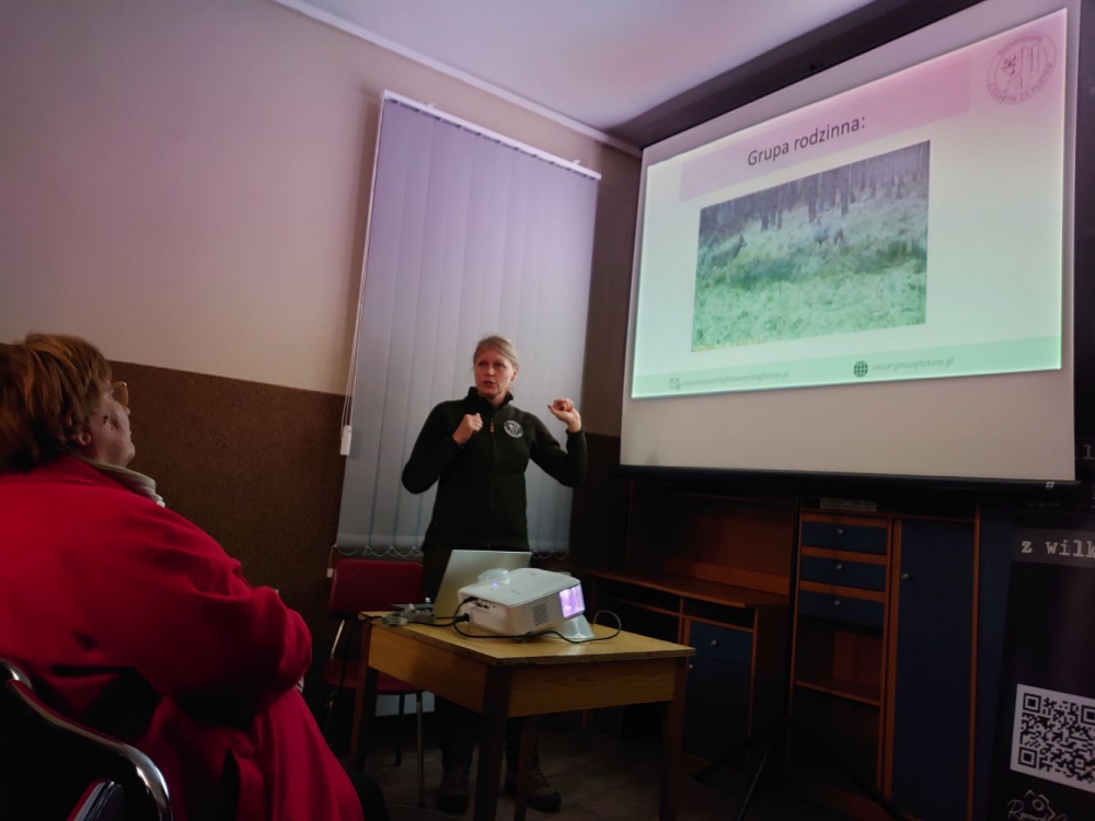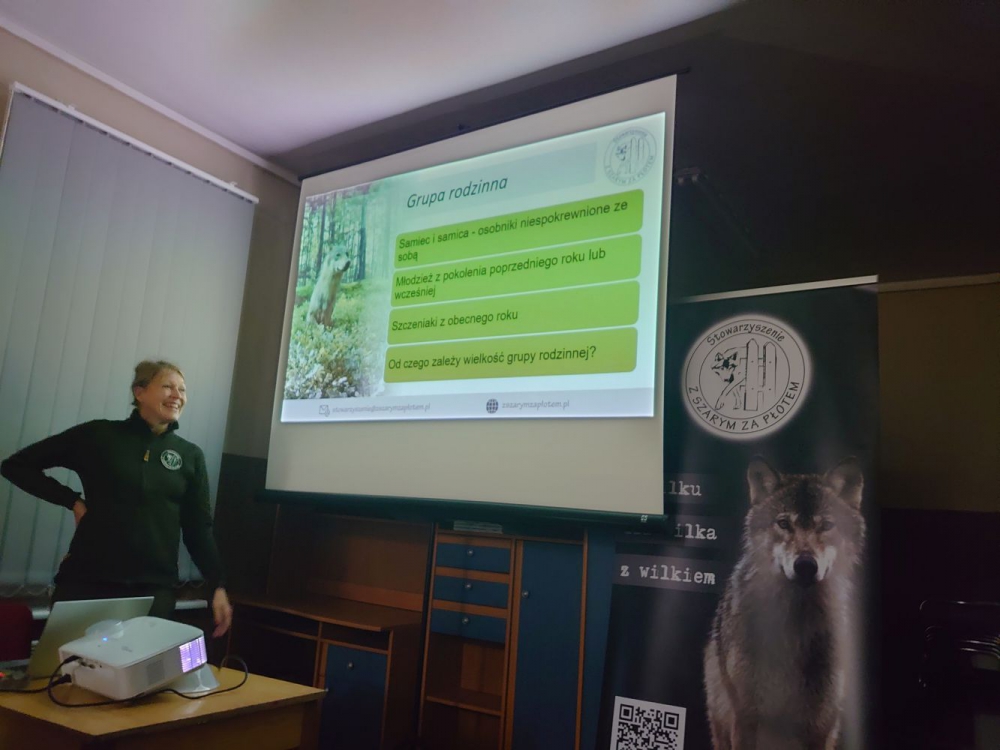 Pani Barbara Zawadzka reprezentująca Stowarzyszenie ?Z Szarym za płotem? oraz Pan Rafał Kłodek reprezentujący Regionalnego Dyrektora Ochrony Środowiska we Wrocławiu, przybliżyli licznie zgromadzonym słuchaczom, tematy związane z naturalnym zachowaniem wilków oraz sposobami postępowania w przypadkach, gdy dochodzi do bezpośredniego kontaktu ludzi ze zwierzętami. Przybliżone zostały naturalne zwyczaje tych zwierząt oraz sposoby zachowania w sytuacjach zagrożenia.