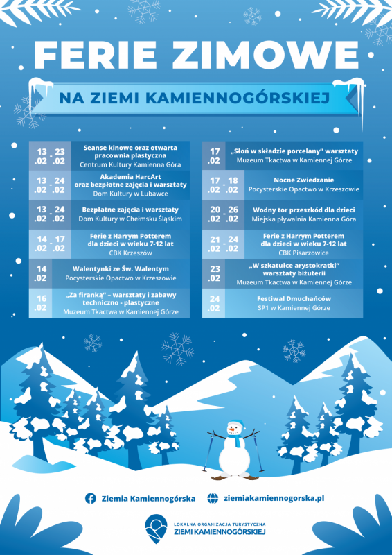 FERIE ZIMOWE NA ZIEMI KAMIENNOGÓRSKIEJ Wydarzenia podczas nadchodzących ferii zimowych. Galeria zdjęć Paulina Rogowska WR Data wydarzenia: 2023-02-10 Stworzony: 2023-02-10 14:10 Edytowany: 2023-02-10 14:12