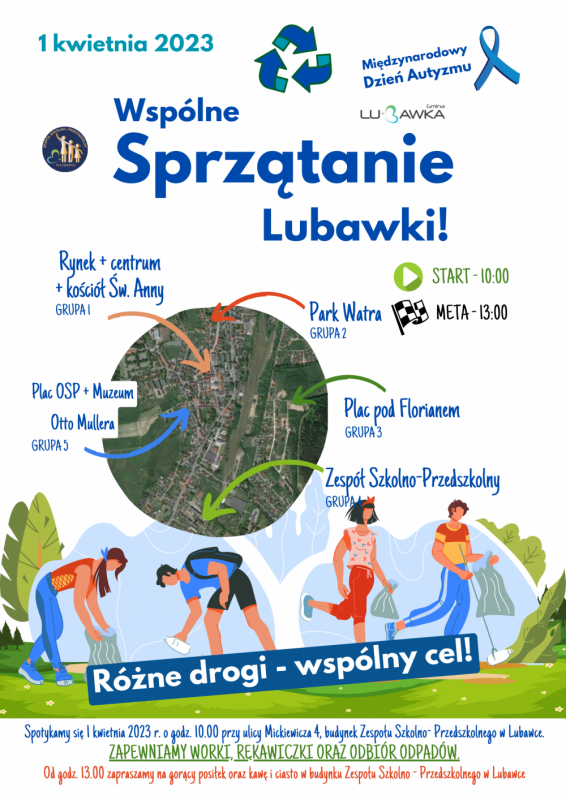 W sobotę, 1 kwietnia 2023 r. odbędzie się Wspólne Sprzątanie Lubawki, pod hasłem: Lubawka - wspólny cel różne drogi. Wydarzenie nawiązywać będzie również do Międzynarodowego Dnia Autyzmu.