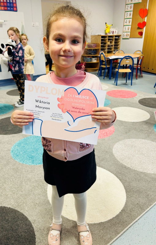 Z radością informujemy, że Wiktoria Moryson z grupy Smerfy zajęła 1. miejsce w Ogólnopolskim Konkursie "Walentynka - od serca dla serca".