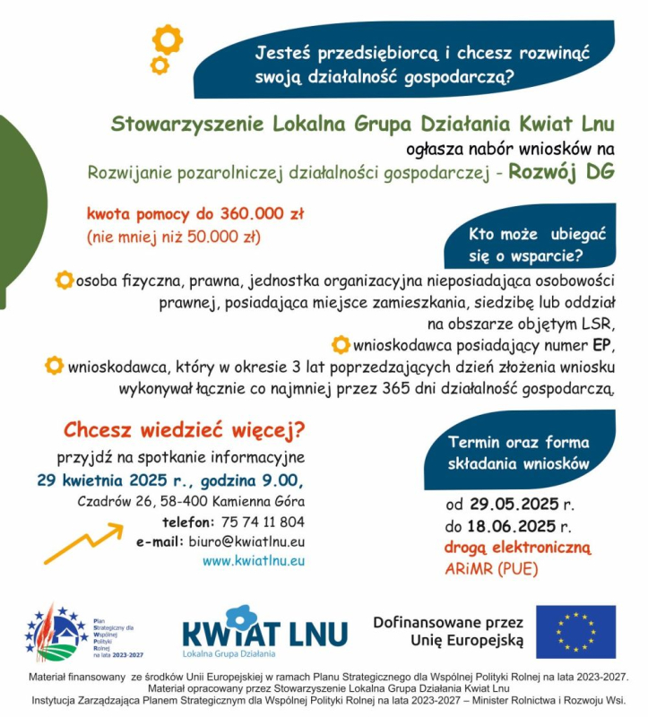 Stowarzyszenie Lokalna Grupa Działania Kwiat Lnu ogłasza nabór wniosków na rozwijanie pozarolniczej działalności gospodarczej - rozwój DG.