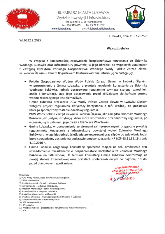 Bezpieczeństwo korzystania ze Zbiornika Wodnego Bukówka Szanowni Mieszkańcy, w załączeniu udostępniamy pismo dotyczące ustaleń związanych z koniecznością zapewnienia bezpieczeństwa korzystania ze Zbiornika Wodnego Bukówka. Galeria zdjęć Paulina Rogowska WR Data wydarzenia: 2025-07-31 Stworzony: 2025-07-31 12:19 Edytowany: 2025-07-31 12:40