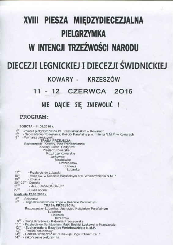W dniach 11- 12 czerwca 2016 roku odbędzie się XVIII Piesza Międzydiecezjalna Pielgrzymka w Intencji Trzeźwości Narodu: Diecezji Legnickiej i Diecezji Świdnickiej na trasie Kowary - Lubawka - Krzeszów pod hasłem "Nie dajcie się zniewolić"
