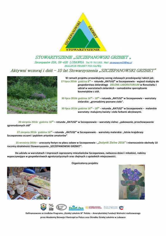 Stowarzyszenie "Szczepanowski Grzbiet" realizuje projekt pod nazwą "Aktywni wczoraj i dziś - 10 lat stowarzyszenia - Szczepanowski Grzbiet" Do udziału w warsztatach i imprezach organizowanych z tej okazji Stowarzyszenie zaprasza serdecznie mieszkańców Szczepanowa, zwłaszcza dzieci i młodzież, rodziny wypoczywające w gospodarstwach agroturystycznych oraz chętnych z sąsiednich miejscowości.