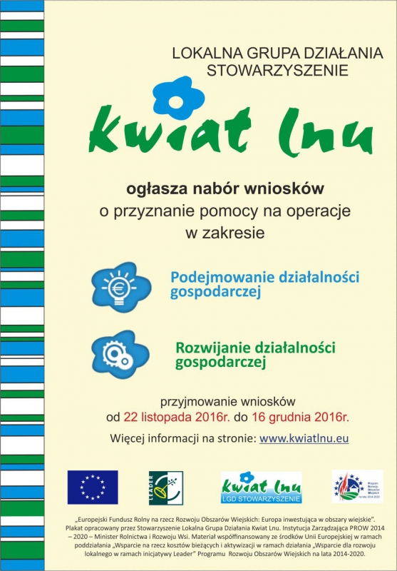 Lokalna Grupa Działania Stowarzyszenie Kwiat Lnu ogłasza nabór wniosków o przyznanie pomocy na operacje w zakresie: