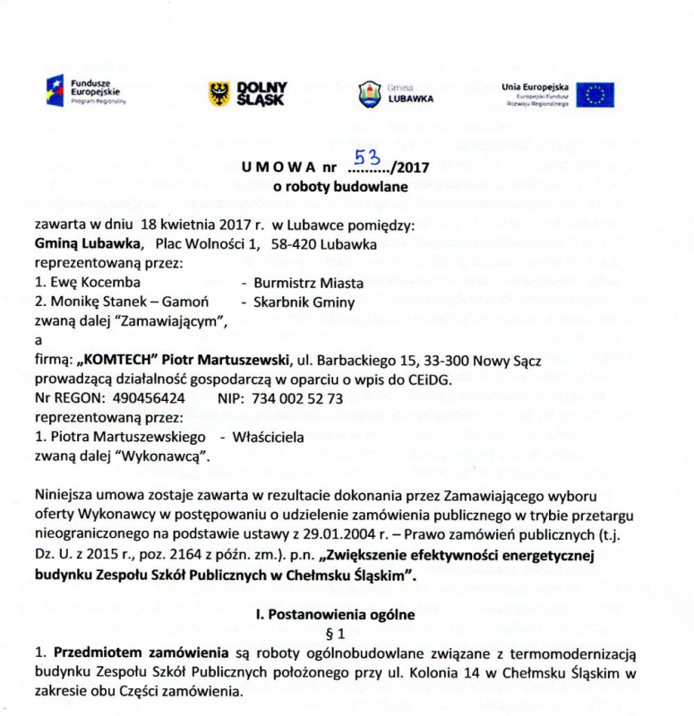 W dniu dzisiejszym tj. /18.04/ o godzinie 13:00 w gabinecie burmistrza w siedzibie Urzędu Miasta Lubawka odbyło się oficjalne podpisanie umowy.