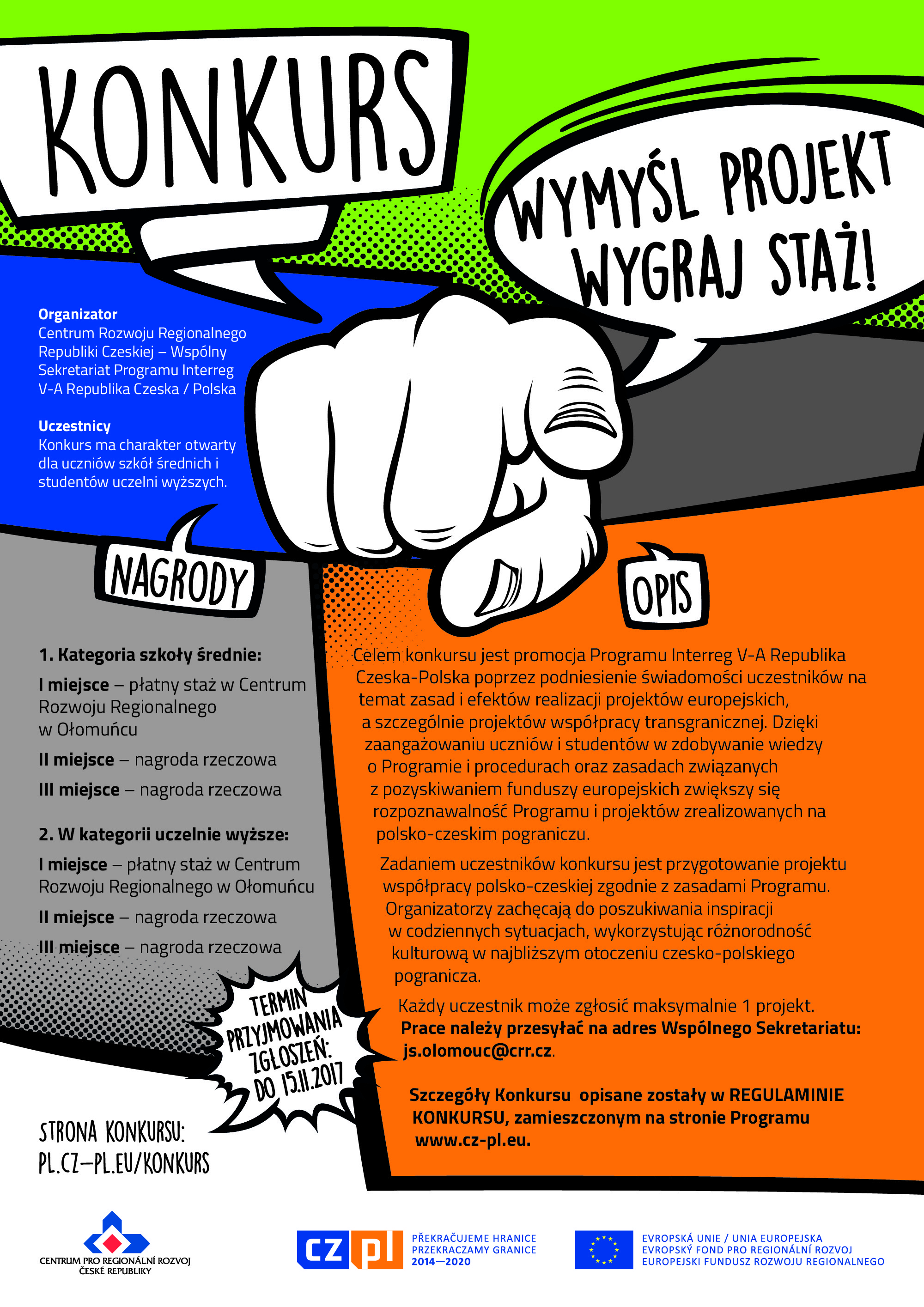 Serdecznie zapraszamy do udziału w konkursie "Wyślij projekt - wygraj staż", którego organizatorem jest Wspólny Sekretariat w Ołumuńcu we współpracy z Centrum Rozwoju Regionalnego Republiki Czeskiej. Konkurs skierowany jest do uczniów szkół średnich i studentów uczelni wyższych. Szczegółowe informacje o konkursie znajdą Państwo w załączniku.