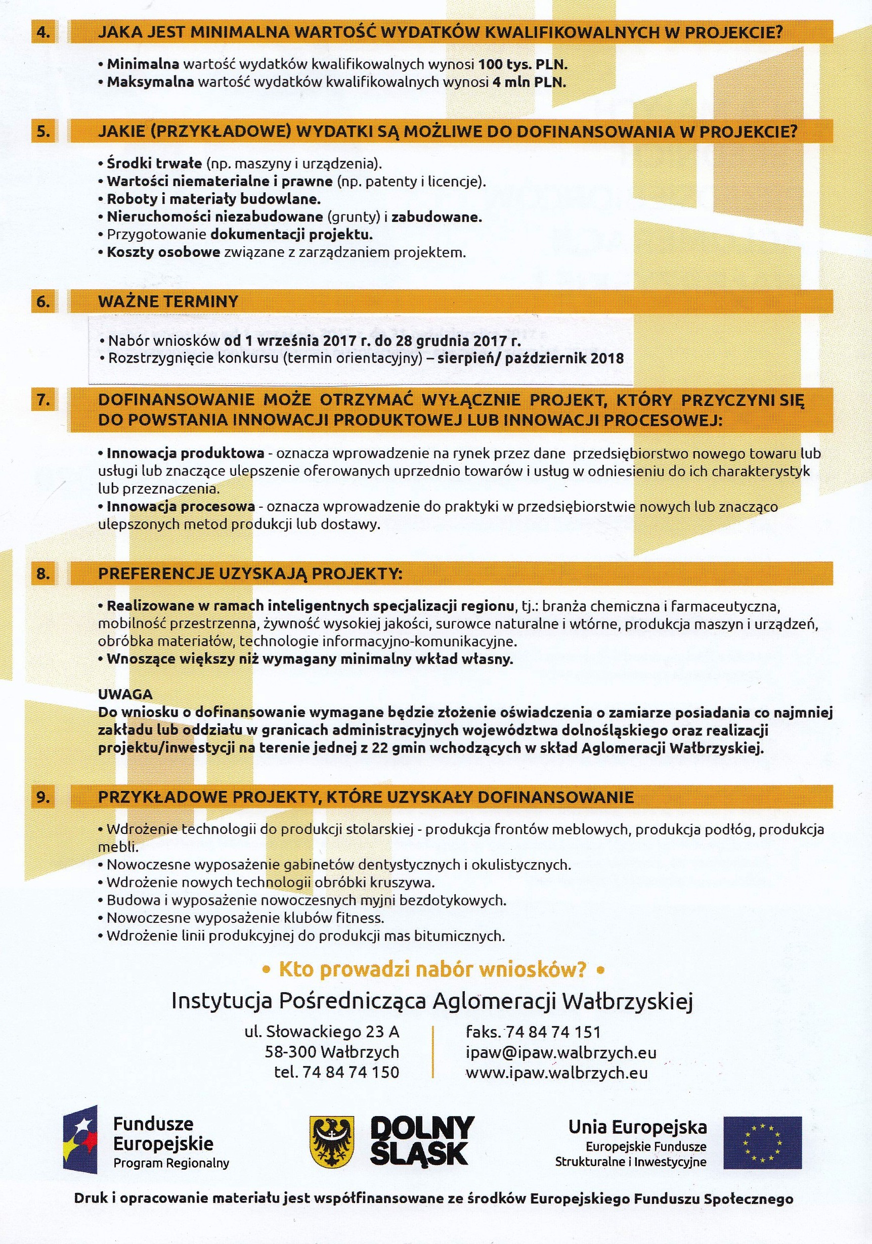 20 mln złotych dotacji dla małych i śrdenich firm Aglomeracji Wałbrzyskiej Blisko 20 mln złotych dotacji dla małych i średnich firm Aglomeracji Wałbrzyskiej. Więcej informacji uzyskają Państwo na załączonym plakacie i ulotce. Pliki do pobrania Plakat Ulotka 1 Ulotka 2 Bartek Ryszkowski OELiUSC Data wydarzenia: 2017-10-19 Stworzony: 2017-10-19 13:29 Edytowany: 2017-10-19 15:03