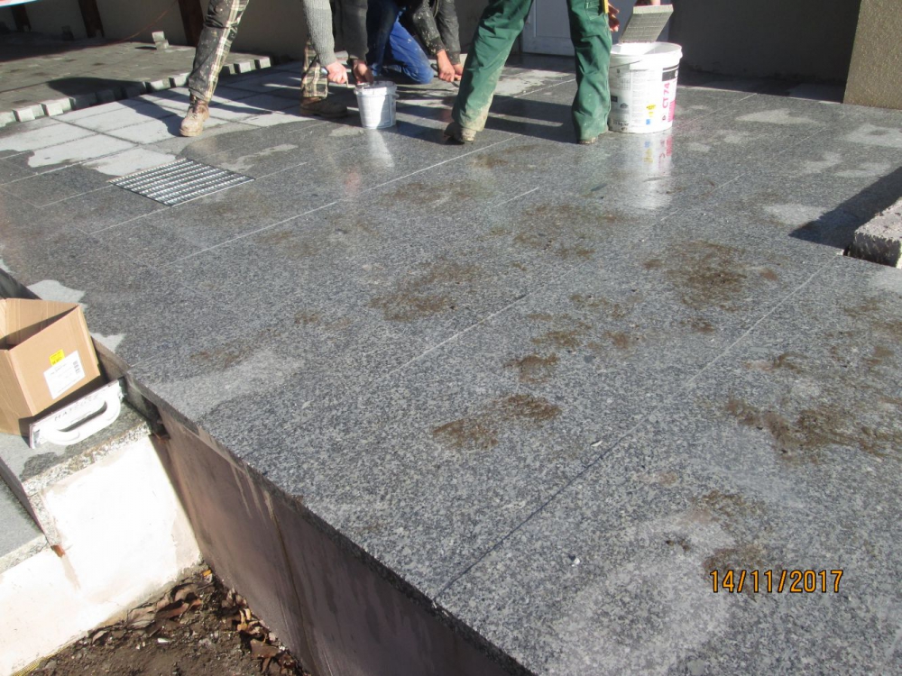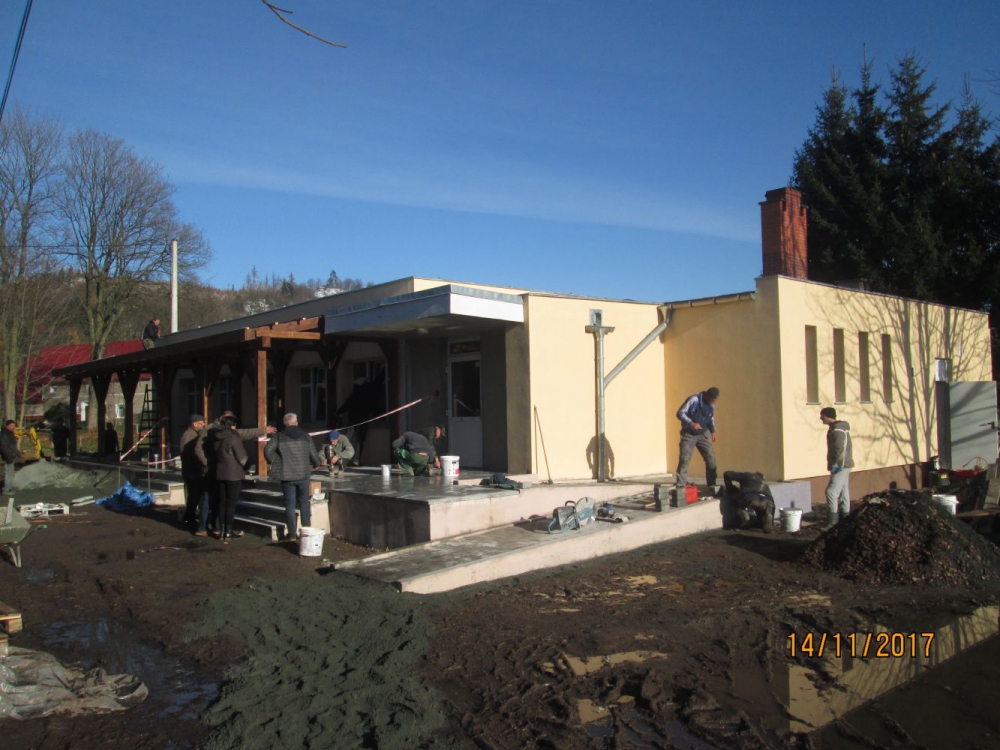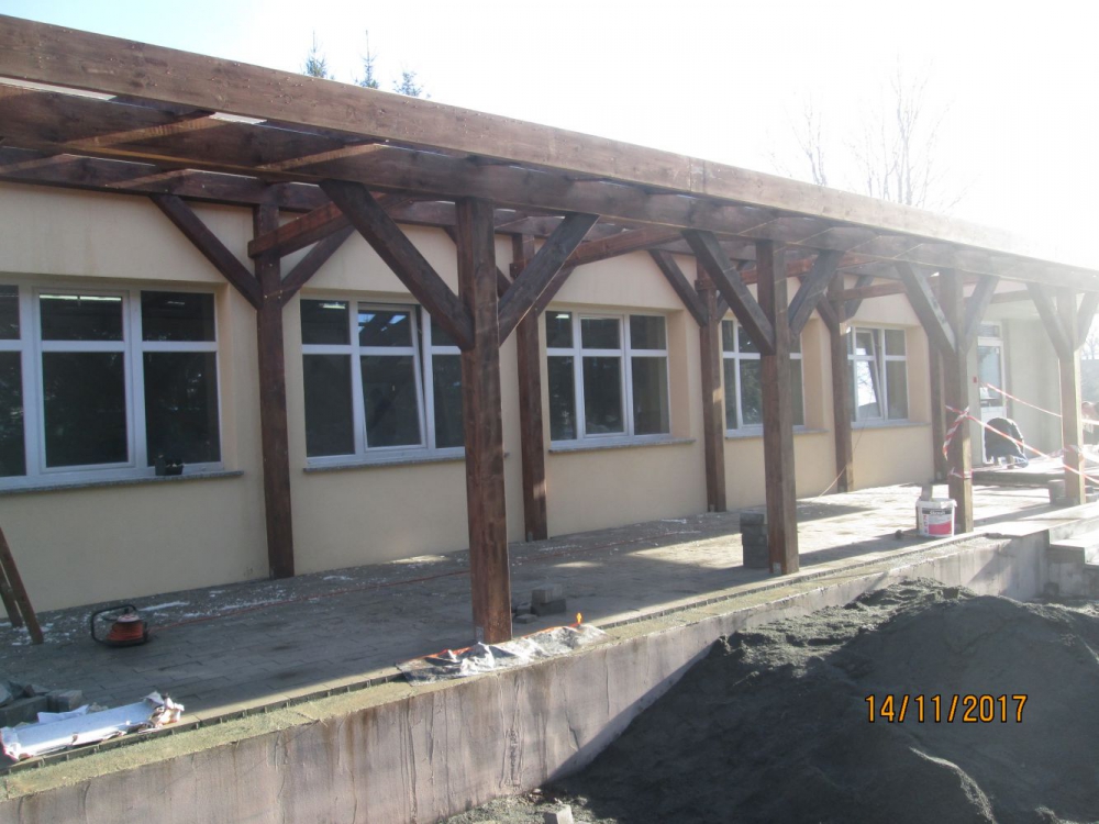 Wylano taras przy głównym wejściu do świetlicy, nad którym montowane jest przekrycie z bezbarwnych płyt poliwęglanowych. Obecnie układana jest kostka na pochylni dla osób niepełnosprawnych oraz płyty granitowe przy głównym wejściu do budynku.