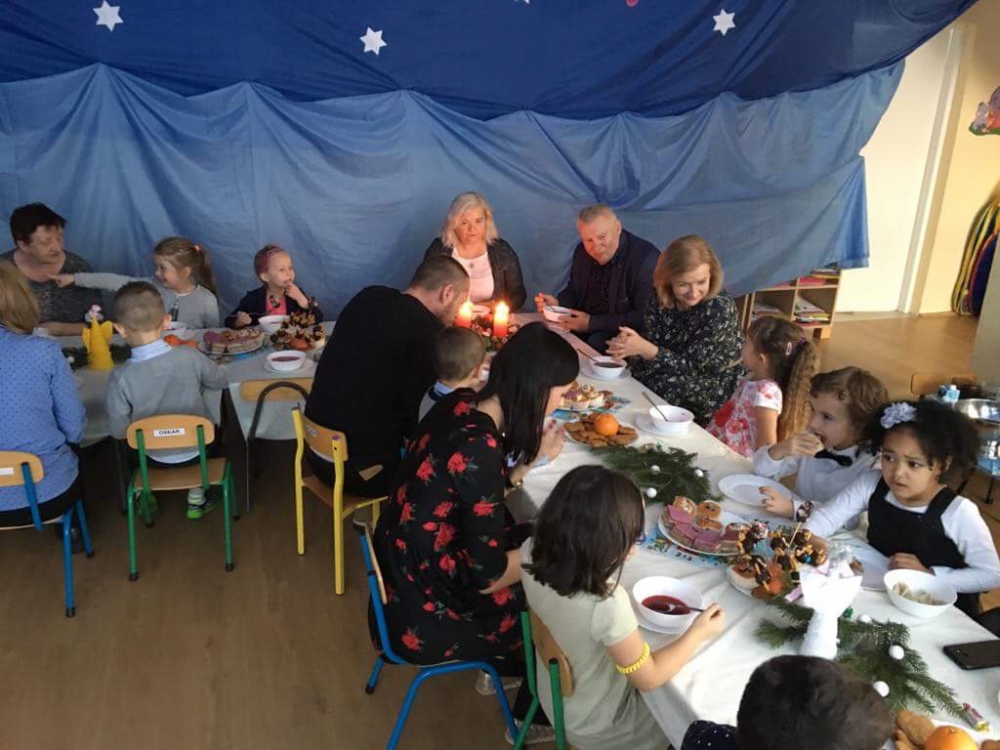 Spotkanie wigilijne w przedszkolu w Chełmsku Śląskim we wspaniałej oprawie świątecznej. Po życzeniach i przełamaniu się opłatkiem wszyscy zasiedli do pięknie przystrojonego świątecznego stołu, na którym znalazły się tradycyjne wigilijne potrawy.