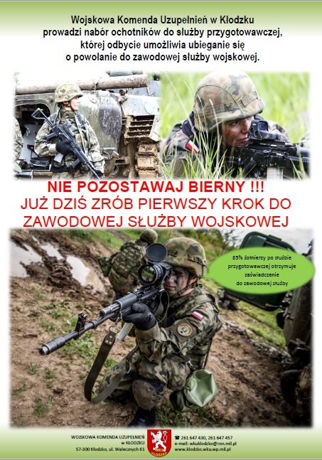 Wojskowka Komenda Uzupełnień w Kłodzku prowadzi nabór ochotników na I turnus służby przygotowawczej kształconych na potrzeby korpusu szeregowych w 2018 r., którego odbycie umożliwia ubieganie sie o powołanie do zawodowej służby wojskowej.