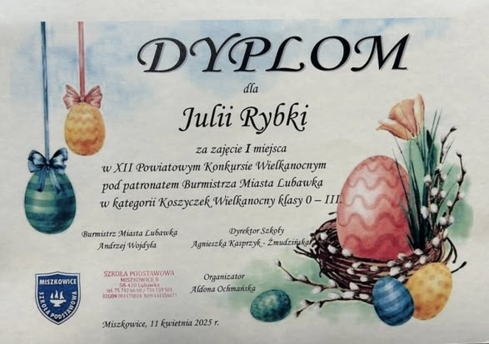 XII Powiatowym Konkursie Wielkanocnym pod patronatem Burmistrza Miasta Lubawka Kolejny sukces naszej Smerfetki. Julia Rybka zajęła 1 miejsce w XII Powiatowym Konkursie Wielkanocnym pod patronatem Burmistrza Miasta Lubawka Galeria zdjęć Julita Rysz Przedszkole Data wydarzenia: 2025-04-11 Stworzony: 2025-04-15 10:21 Edytowany: 2025-04-15 13:12
