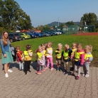 Maluszki obserwowały ruch drogowy i w odblaskowych kamizelkach uczyły się prawidłowego przejścia przez jezdnię.